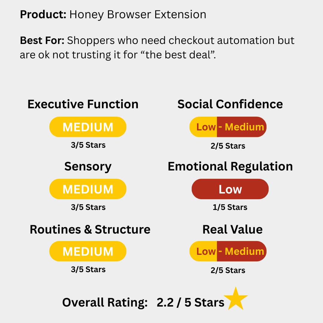 Bottom line: Honey automates coupon finding, which does reduce executive function load at checkout. But it does so while lying to you, exploiting creators, and likely slowing your device.